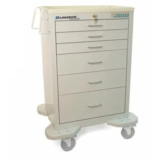 This lightweight aluminum isolation cart features self-closing, steel ball-bearing, full-extension drawer slides, and customizable drawer configurations. It comes with an electronic lock with keypad access for up to 250 users per cart.