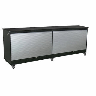 This cart offers two pull-out shelves and two bottom shelves for organized storage. It features two locking roll-top doors to secure supplies and is made from corrosion-resistant, non-metal HDPE construction.