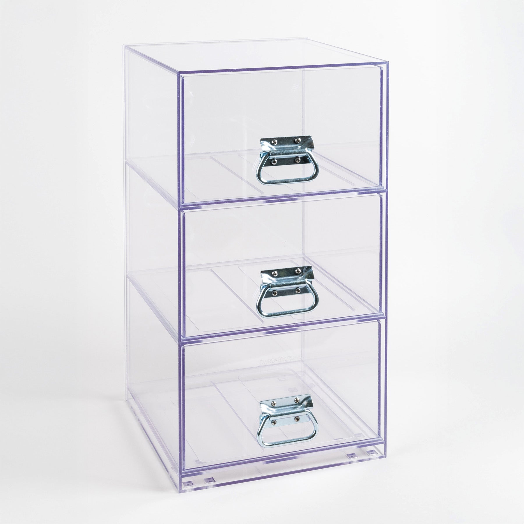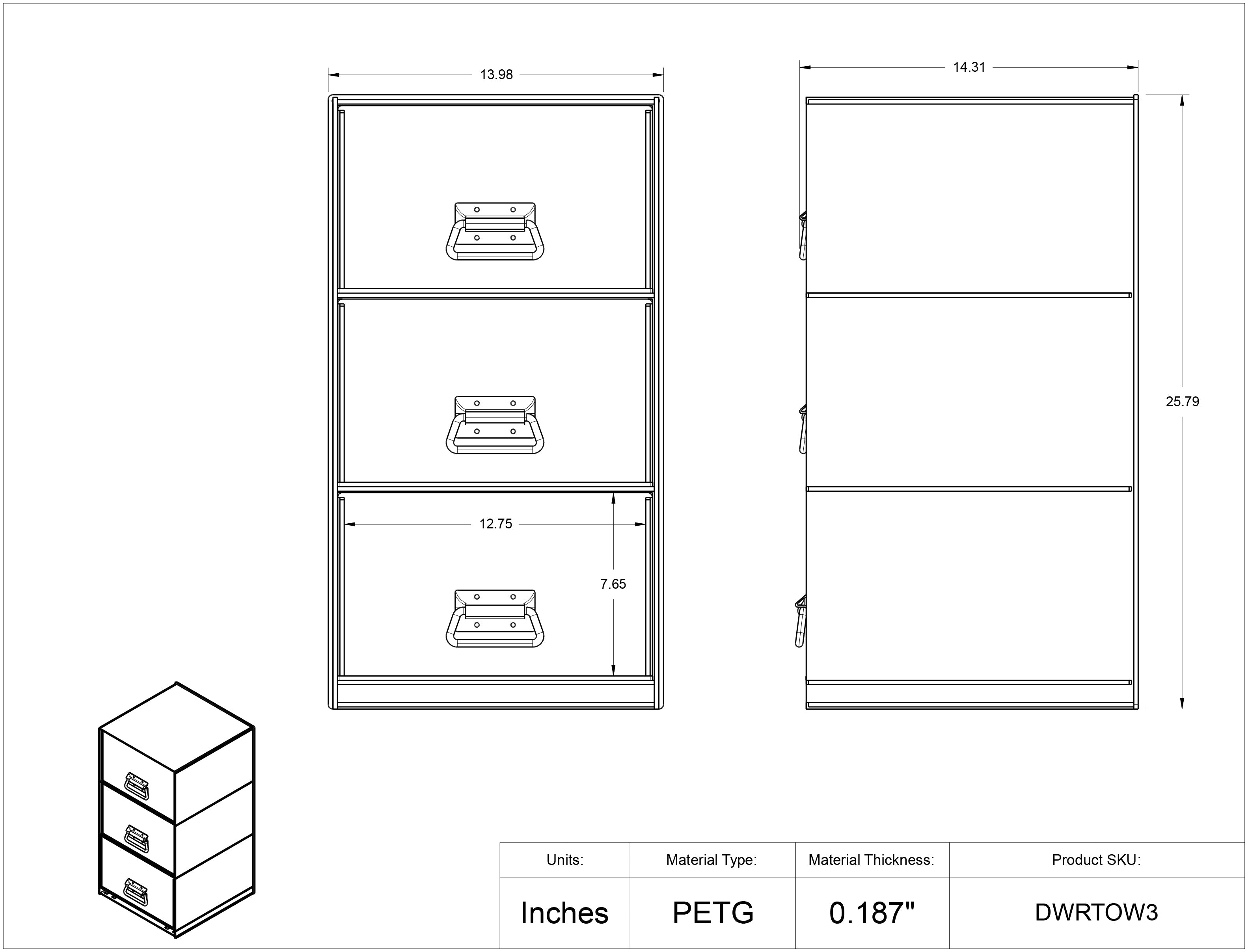 3 drawer tower. Cleanroom suitable. Rubber bumpons on base. Zinc plated handles. Durable PETG construction.