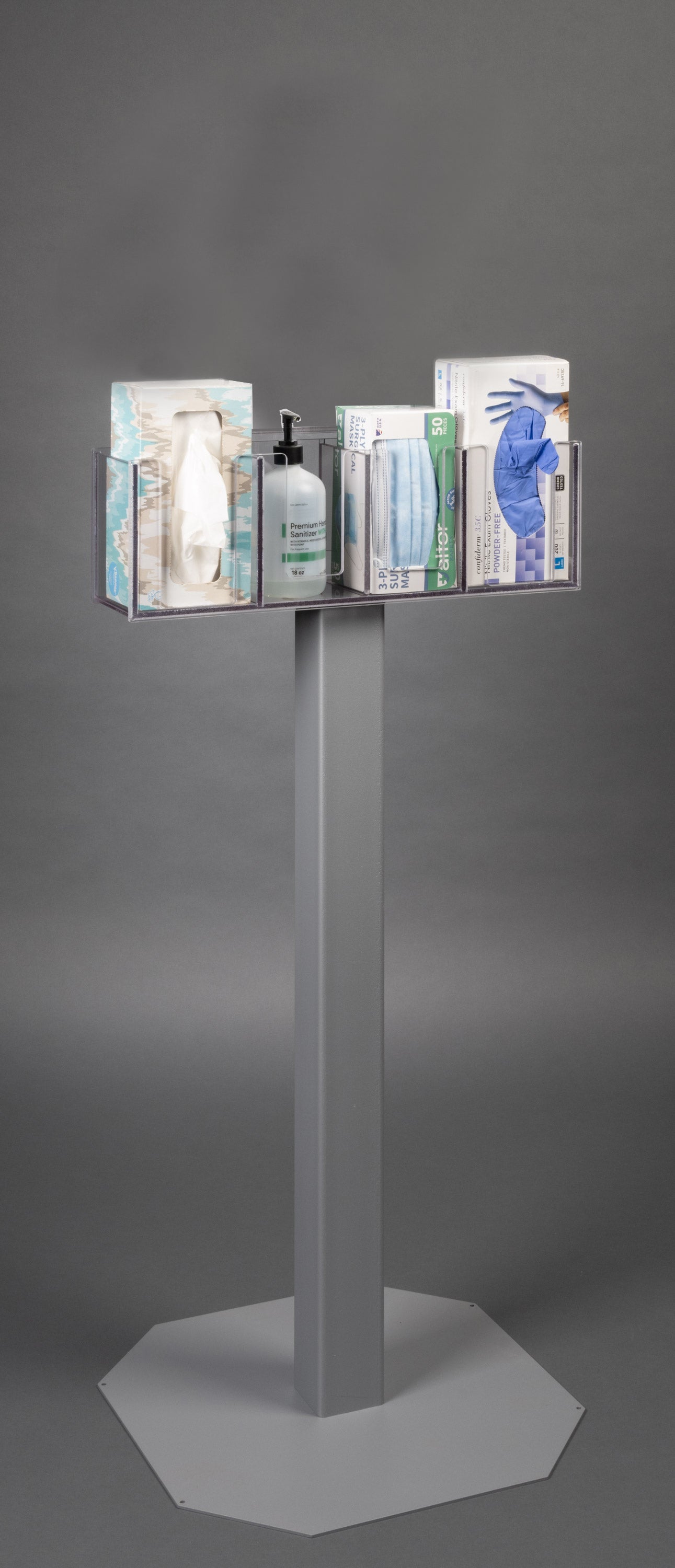 Respiratory hygiene station. Durable PETG construction. Comes with durable powder-coated steel stand. Choose from 4 or 5 position. See image for dimensions. CONSUMABLES NOT INCLUDED.