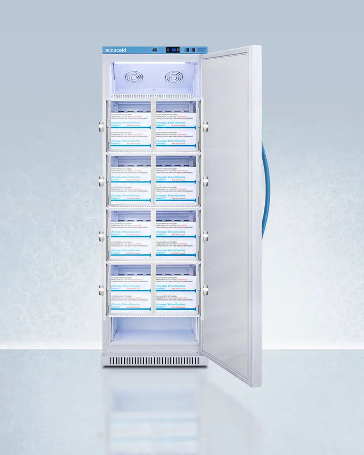 Accucold's Pharma-Vac Performance Series are upright all-refrigerators designed and purpose-built for pharmacy, medication, and vaccine applications to support meeting CDC/VFC/VFA guidelines, with a powder-coated silver ion handle that helps prevent germ spread.