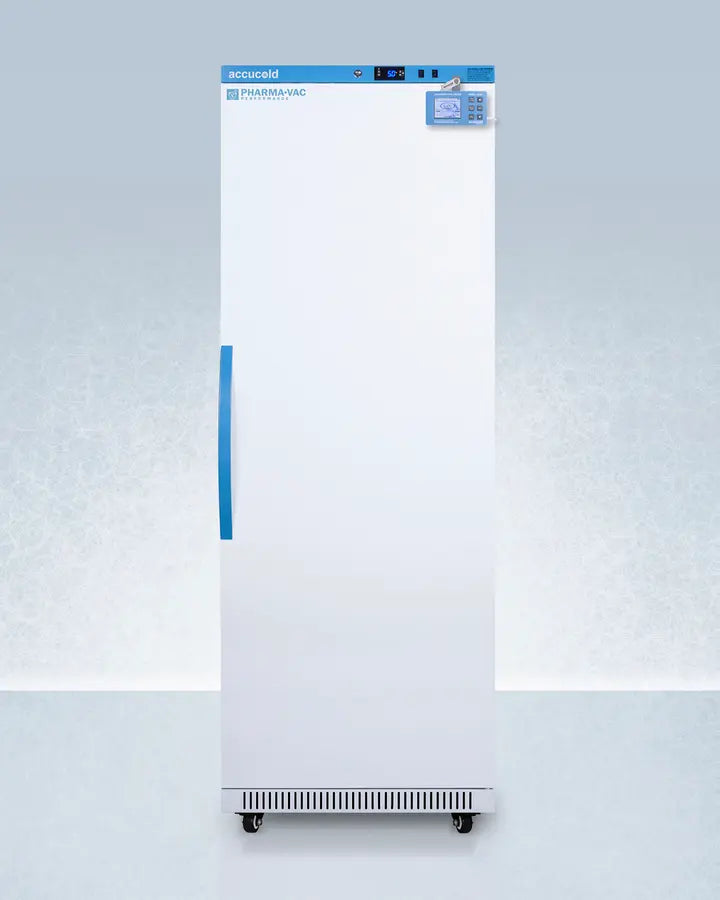 Accucold's Pharma-Vac Performance Series are upright all-refrigerators designed and purpose-built for pharmacy, medication, and vaccine applications to support meeting CDC/VFC/VFA guidelines, with a powder-coated silver ion handle that helps prevent germ spread.