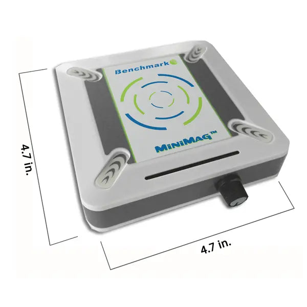With a square footprint of under 5 inches, the MiniMag™ is the most compact stirrer in the Benchmark line. Despite its modest dimensions, the 3.4 inch square work surface accepts a wide variety of beakers, flasks, bottles and other laboratory vessels for stirring volumes as large as 1.5 liters.