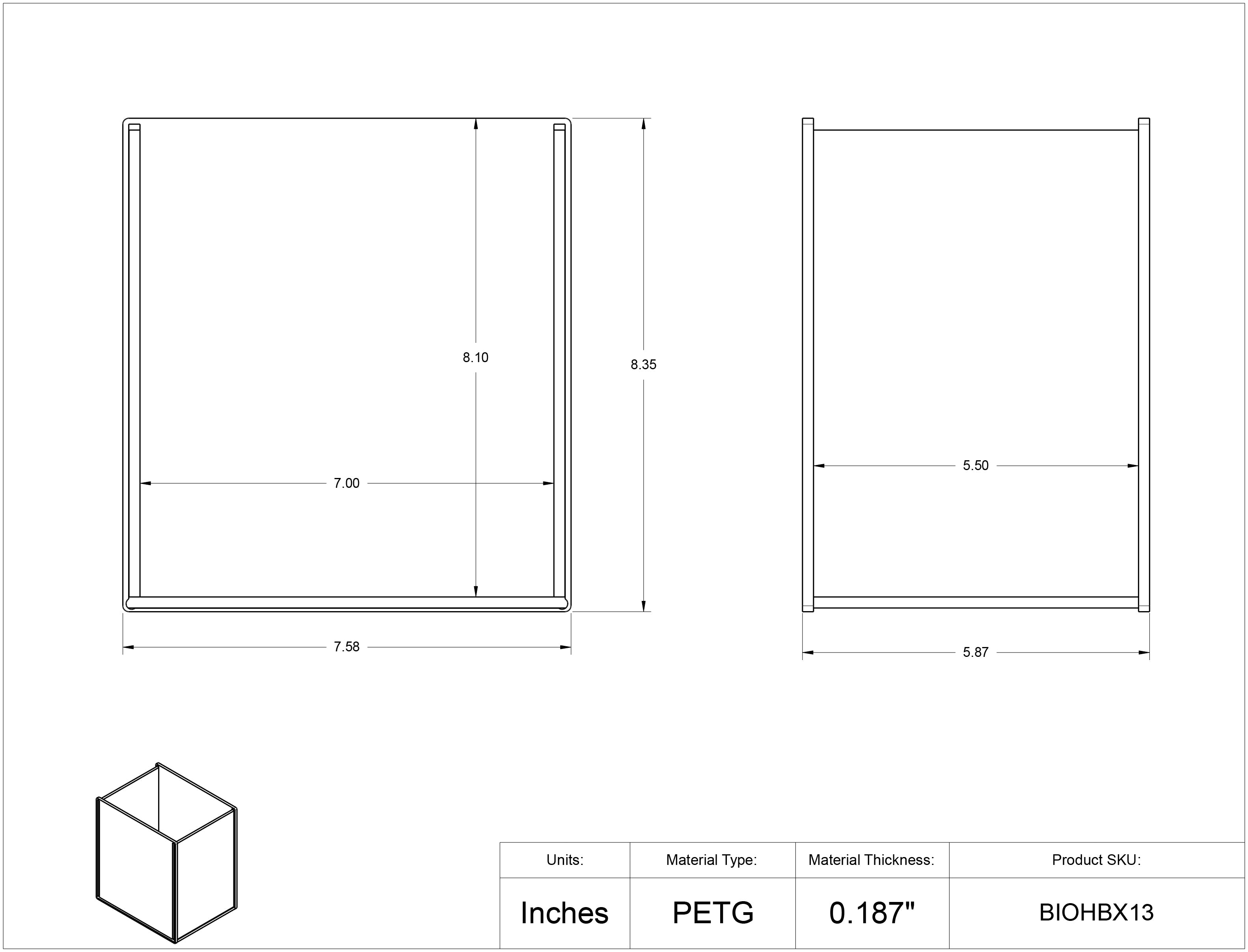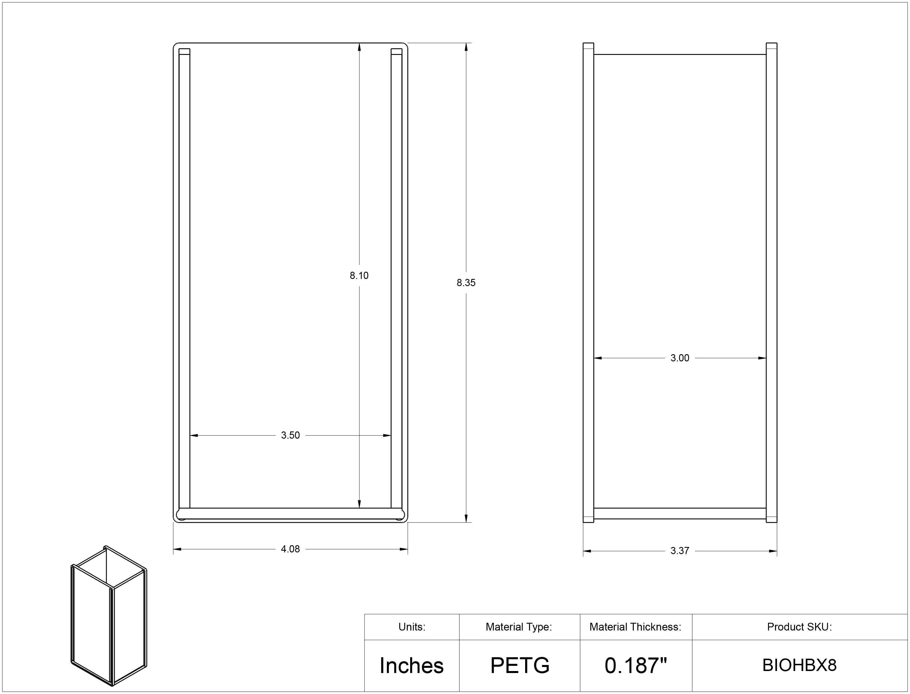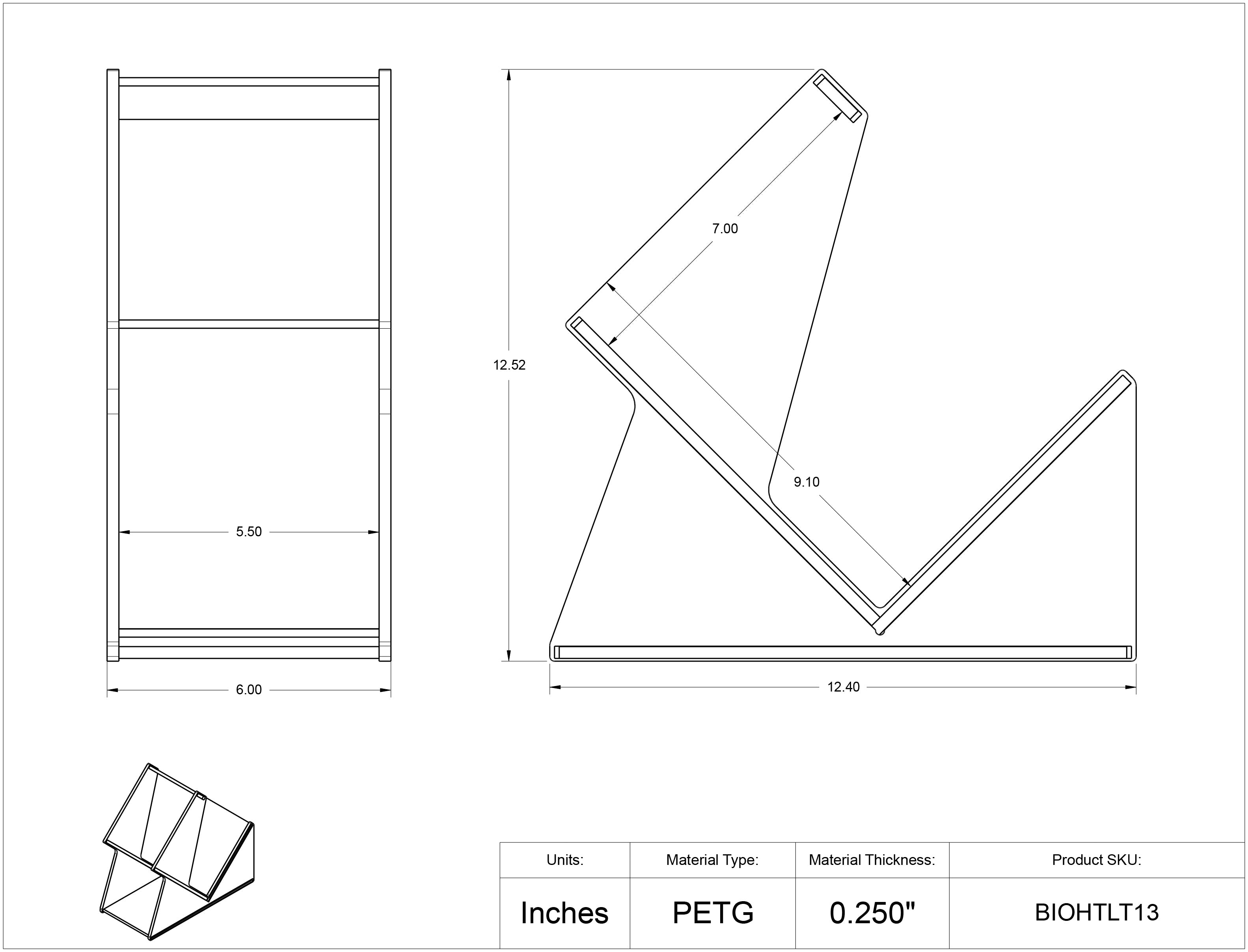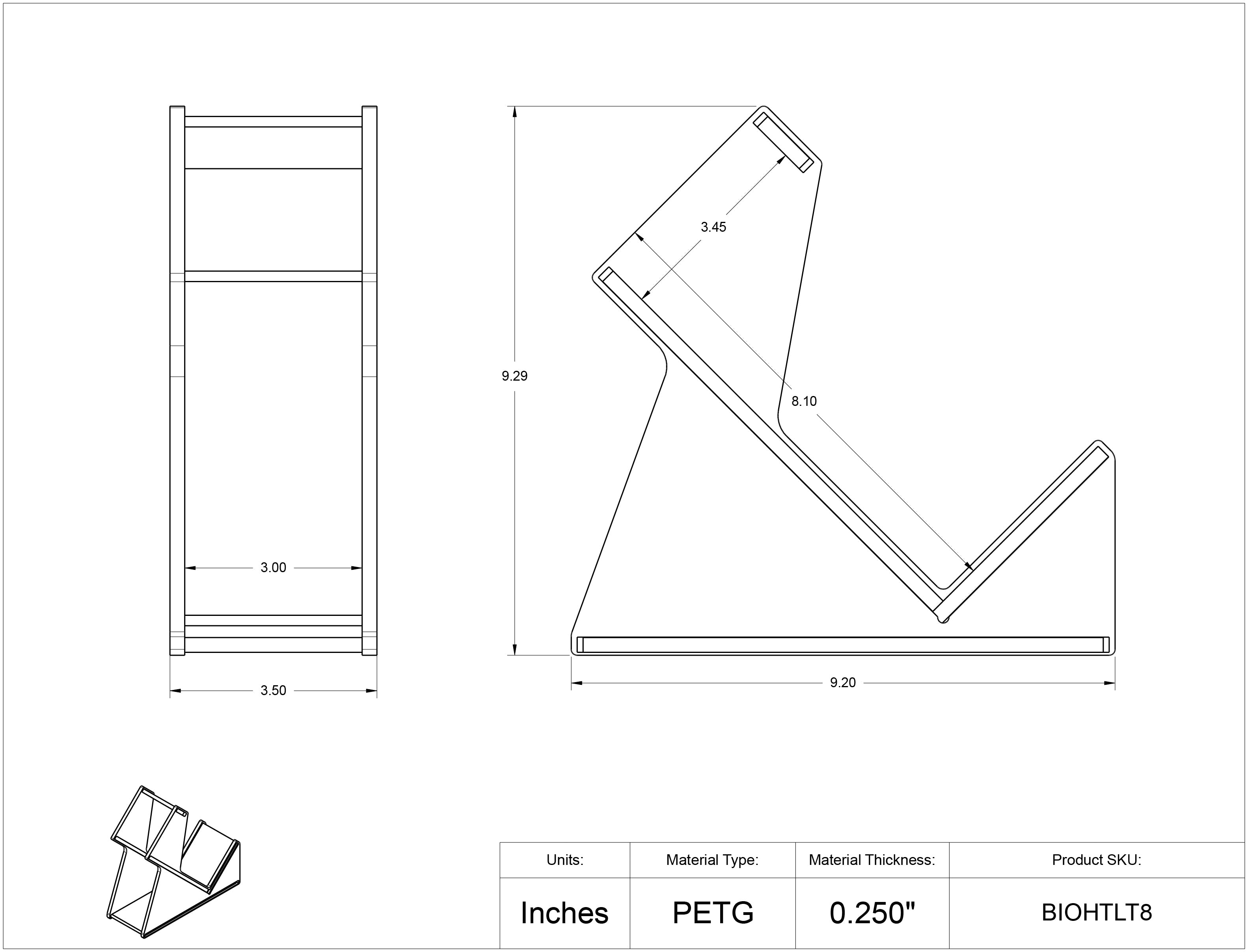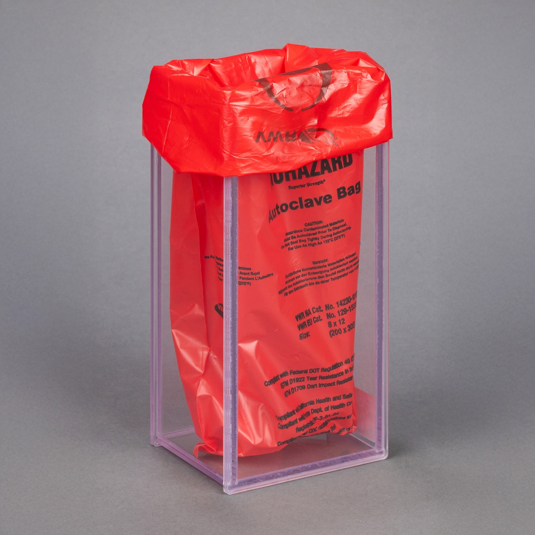 Benchtop biohazard bag holder allows for a cleanable mount for your biohazard bags. Comes in two sizes to fit either 8x12in or 14x19in biohazard bags. Constructed from super durable and cleanable PETG. Rubber bumpons on base for non-slip surface. See image for dimensions.
