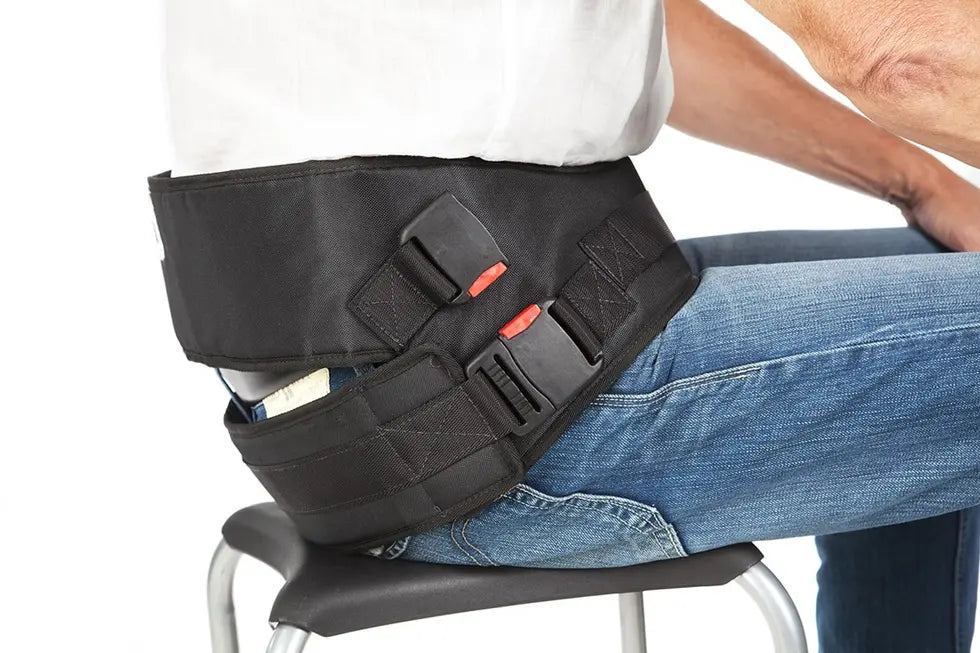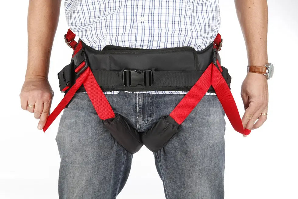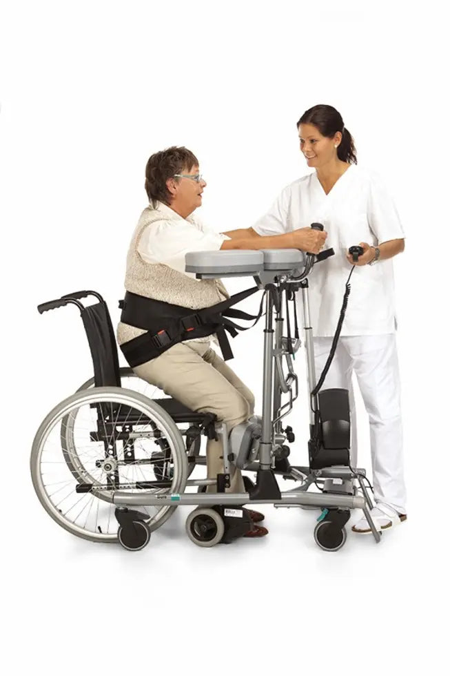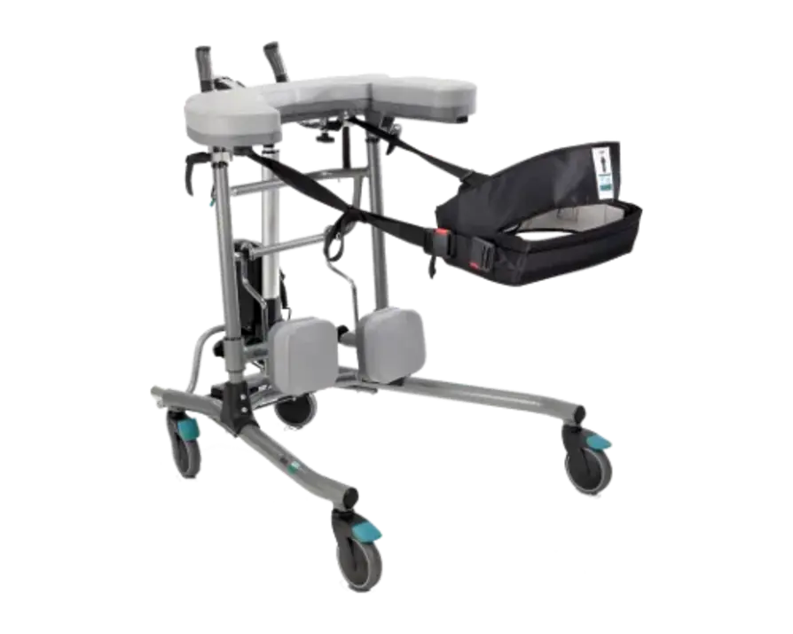 A divided lifting sling, available in three sizes, is positioned across the patient's lower back to provide stable support during the stand-assist process. The electric frame-widening function allows precise adaptation to each patient's body dimensions and balance needs, promoting confidence and autonomy during gait training and rehabilitation exercises.