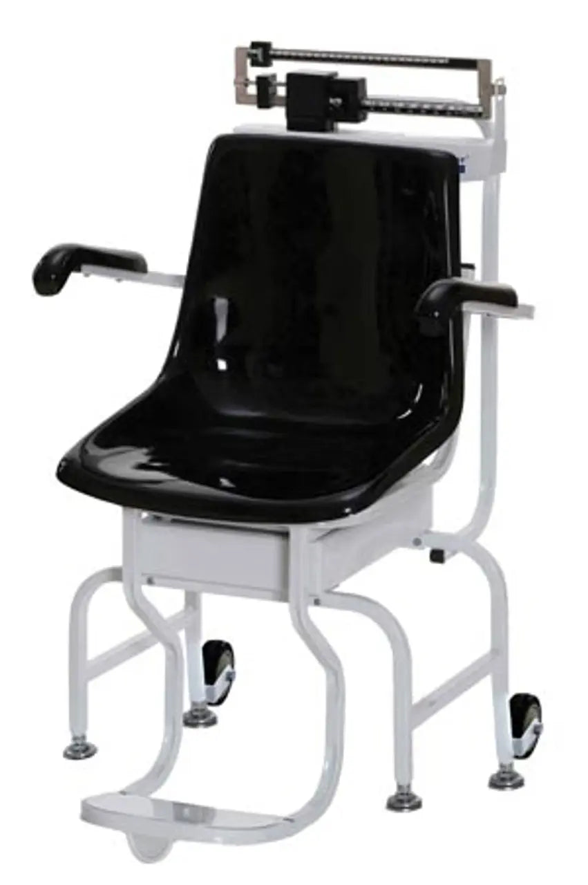 Healthometer brand Chair Scale Mechanical HOM with 440 lb / 200 kg capacity and 1/4 lb / 100 g graduation. Seat size 16-1/2 x 18-1/2 x 17-1/8 inches, (2) wheels for ease of movement, flip arm and foot rest, easy to clean plastic seat, 2 Year Limited Warranty. Designed for accurate, comfortable patient weighing in clinical or home settings, featuring a durable steel frame and user-friendly design for quick setups and mobility.