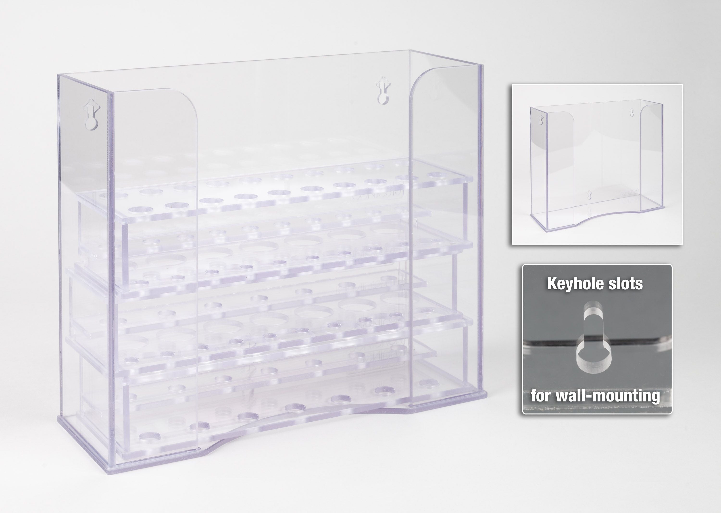The vertical slot design keeps CONIC racks upright, stable, and easily accessible, preventing tipping or damage while allowing quick retrieval of any rack. All mounting versions include rubber bump-ons on the base for optional stable countertop placement when not wall-mounted. Ideal for consolidating and protecting multiple conical tube racks in one organized location, freeing up bench or shelf space.