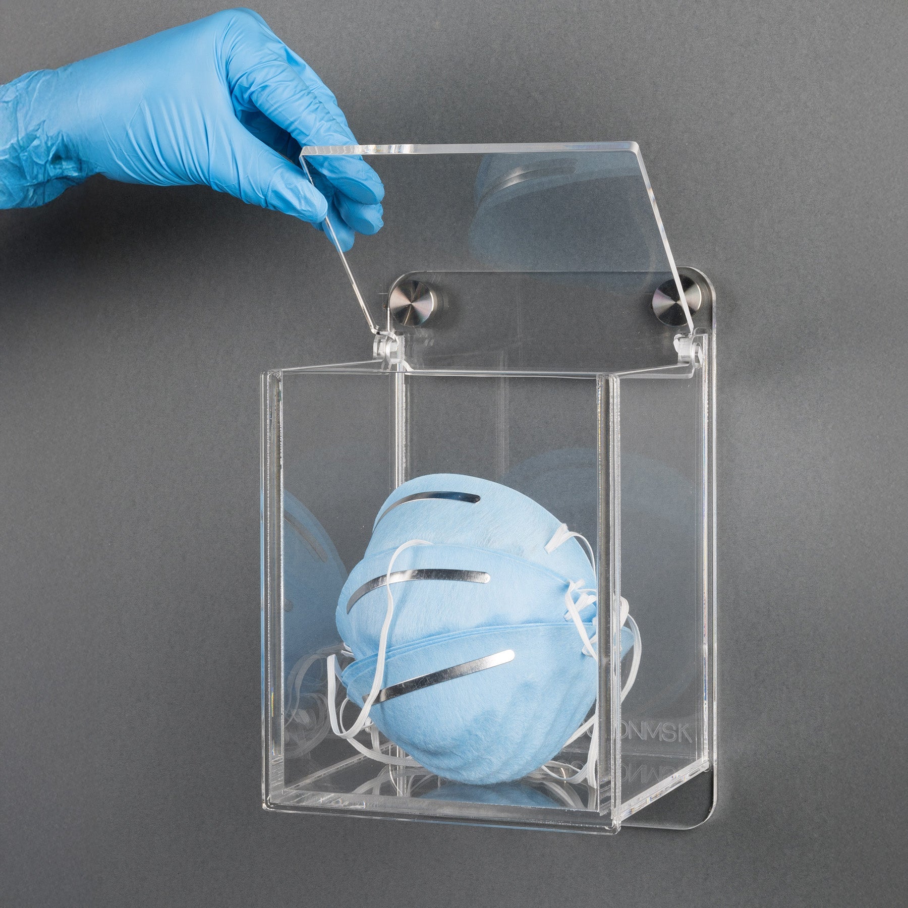 The Poltex DECO line features durable 1/4in thick acrylic construction, shiny, flame-polished edges, and stainless-steel caps for mounting for a decorative look. Holds a stack or box of cone masks. Lid helps to keep the dust out. Includes all mounting hardware (screws, anchors, stainless steel caps). SEE IMAGE FOR DIMENSIONS.