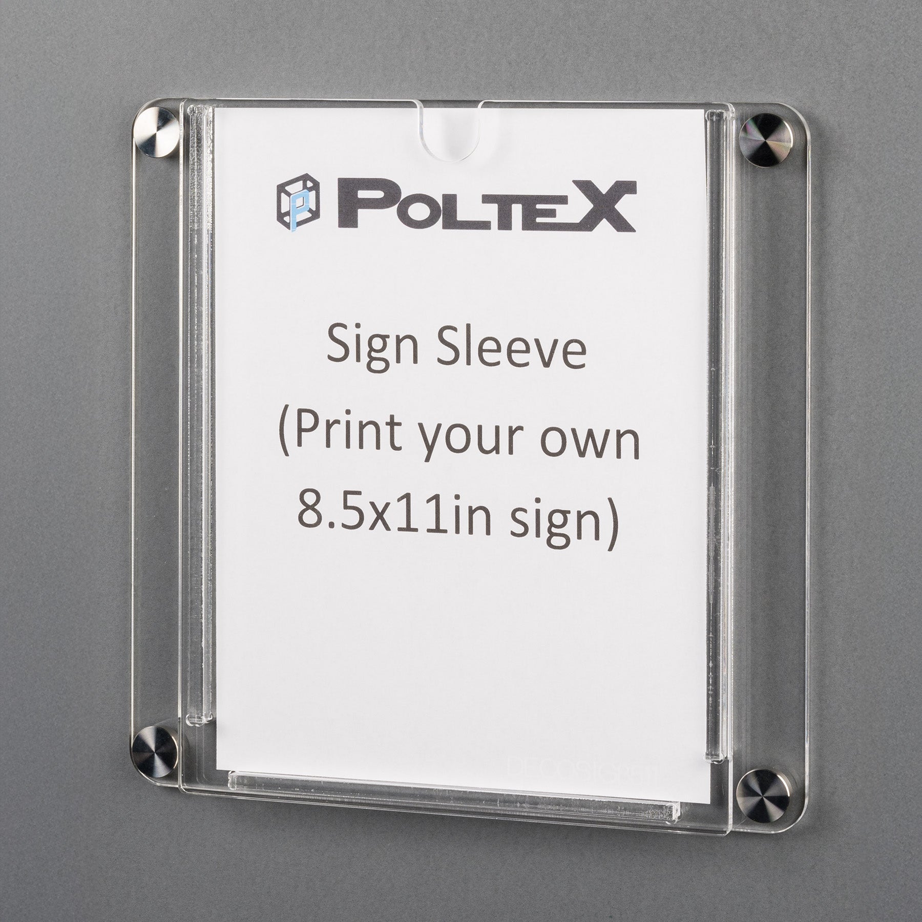 Poltex’s DECOSIG8511-W Deco Sign Sleeve is a sleek, decorative sign protector from the Deco line, crafted from durable 1/4" thick acrylic with shiny, flame-polished edges and stainless-steel caps for a modern, high-end appearance. This wall-mount sleeve securely holds standard 8.5x11 inch signs, posters, instructions, or notices, allowing easy insertion and removal while protecting them from dust, splashes, or wear. Mount in either portrait or landscape orientation to suit your display needs. Includes all mounting hardware (screws, anchors, stainless-steel caps) for quick, secure installation on walls or panels. Ideal for clinics, offices, labs, waiting rooms, or public areas to communicate important information clearly and professionally. Consumables (signs/documents) not included; see product image for exact dimensions. Made in USA for reliable, long-lasting performance that combines functionality with a polished, decorative style.