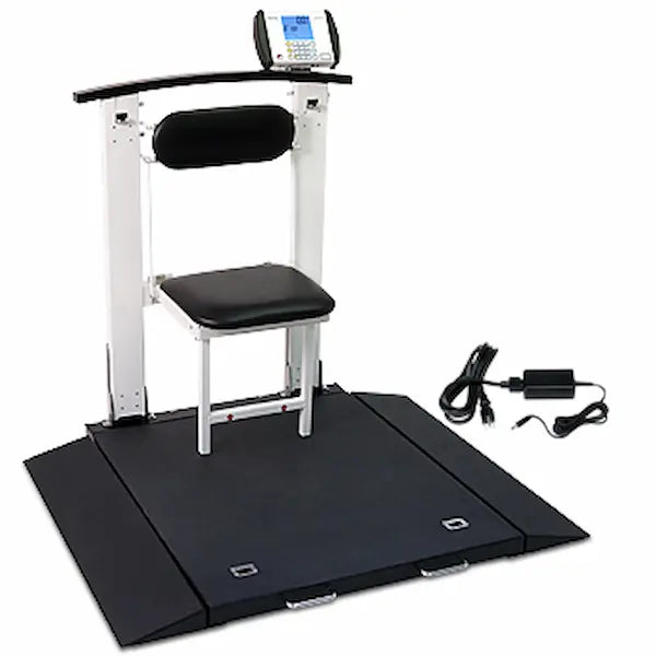 The Detecto 6570 Series Portable Wheelchair Scale is a versatile 3-in-1 scale designed for seated, standing, and wheelchair weighing. Featuring a folding column and chair seat, this scale ensures patient safety and stability while providing accurate weight readings up to 1,000 lb / 450 kg with 0.2 lb / 0.1 kg precision. Two-way ramps allow easy access from both sides, and the scale supports up to 99 tares to account for wheelchair weight. Optional Wi-Fi/Bluetooth connectivity enables seamless integration with EMR/EHR systems. Compact fold-up design with integral wheels allows for fast transport and vertical storage, making it ideal for hospitals, rehabilitation centers, and long-term care facilities.