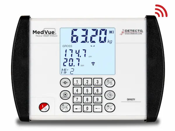 DETECTO’s MedVue® medical weight analyzer is utilized on select clinical scales, including DETECTO’s wheelchair, bariatric, and stretcher scales. The MedVue® features a vivid 3.5-in-wide by 3-in-high backlit LCD display screen with nearly 1-in-high weight digit readouts for easy visibility. The MedVue’s 350-degree swivel mounting bracket allows the display to be tilted and rotated into position wherever it is the most convenient for the medical professional and/or patient to view. A host of other benefits include units locking into kilograms or pounds, 14-digit patient ID which may be entered via the alphanumeric keypad, 99 stored tare weights, 200 stored transactions, 1LOOK display, four different languages available in set-up (English, Spanish, French, and German.), and Wi-Fi/Bluetooth models are available with up to 150 ft. wireless range. The MedVue® offers a host of both wired and optional wireless connectivity for sending measurement data to multiple devices all at once.