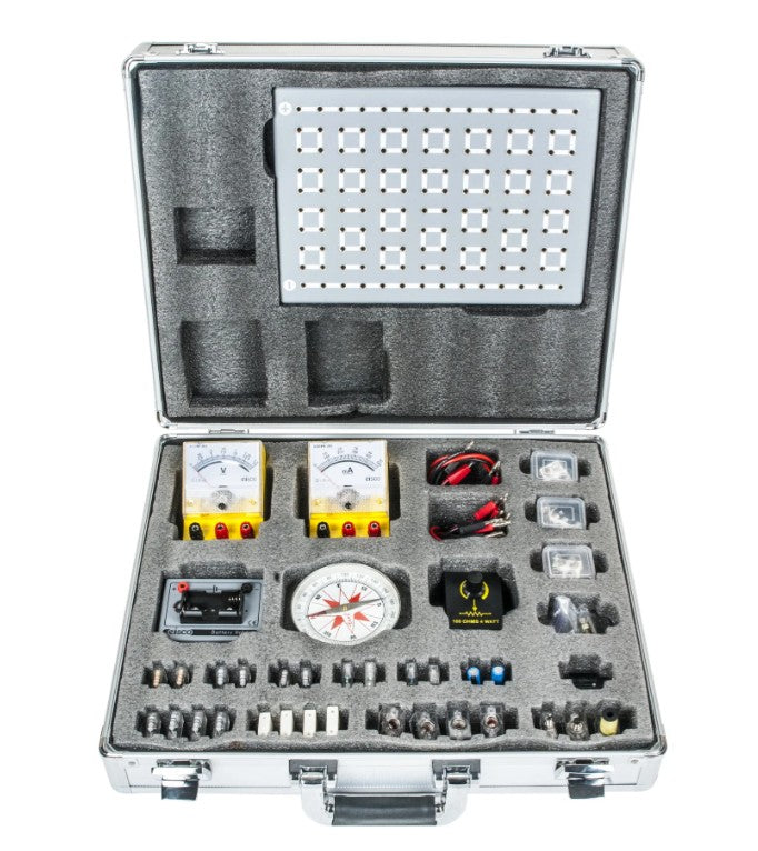This Electricity System 1 Physics Kit comes with 51 components, including a Circuit Board, and all the resistors, lamps, voltmeters and ammeters one needs to investigate core concepts in introductory electricity.