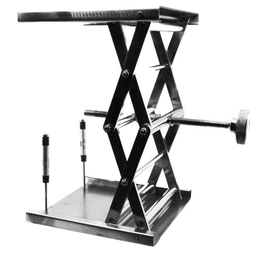 - EXTENDABLE || Adjustable lab jack with stainless steel molded handle and hole for fine threaded adjustment rod - Easy, fluid, pressure-supported movement of platform with and without load for precise height adjustments