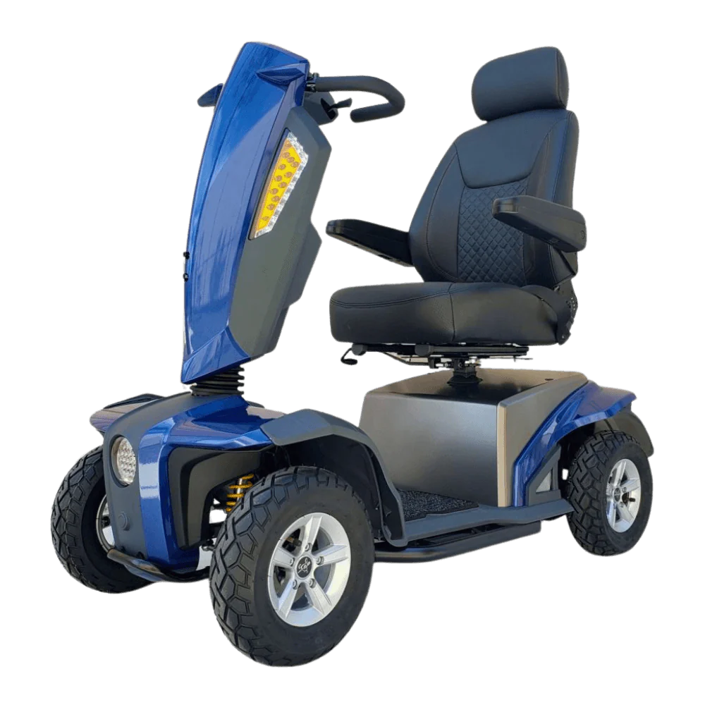 Rugged Performance Meets Everyday Comfort. The EV Rider VitaXpress All-Terrain Mobility Scooter is a heavy-duty, outdoor-ready mobility scooter built for those who crave adventure without sacrificing comfort. Powered by a robust 750-watt 4-pole motor, this scooter is made to handle grassy parks, gravel paths, and bumpy trails with ease. Whether you're commuting through the city or cruising through nature, the VitaXpress combines speed, range, and all-terrain capability to keep you moving freely. Spacious, Supportive Seating. Comfort is key on long outdoor rides, and the VitaXpress excels with its generously sized 20-inch captain’s seat. This seat features plush cushioning, a supportive high back, and adjustable settings for recline, height, and armrests. Whether you’re enjoying a trail or navigating a grocery store, you’ll ride in total comfort. Full Scooter Dimensions. The EV Rider VitaXpress is thoughtfully designed with balanced proportions and a compact turning radius for an all-terrain scooter of its class. It measures approximately 53" L x 26" W x 54" H. The front wheelbase is slightly narrower than the rear, helping with maneuverability. The turning radius is just 49 inches, allowing for tight turns even in semi-narrow spaces. The tiller is fully adjustable and extends upward to accommodate a range of user heights for maximum control and comfort. Battery & Charging Details. The VitaXpress is powered by two 12V 80AH sealed lead-acid batteries, offering up to 28 miles per full charge, depending on rider weight and terrain. The scooter comes with an off-board charger, and charging typically takes 6 to 8 hours. Equipped With Bright LED Headlights. Night rides and early morning outings are no issue, thanks to the integrated LED headlight system. These high-visibility lights illuminate your path while enhancing your visibility to others, promoting safety during low-light conditions. Reflective accents further improve visibility for added peace of mind. Intuitive Tiller Control System. The tiller of the VitaXpress is designed with user ergonomics in mind. The Delta-style tiller features wraparound handlebars that are easy to grip, reducing strain on the hands and wrists. The control panel shows, battery level, along with easy-to-use switches for speed adjustment, headlights, and horn. Available in Red and Blue.