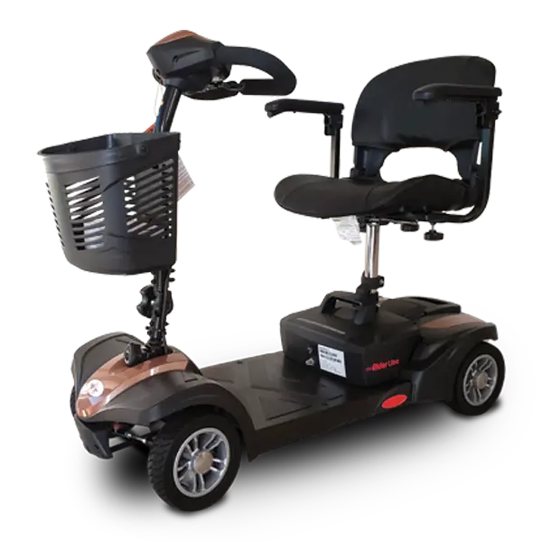 The MiniRider Lite is a transportable scooter with the stability of a 4-wheel scooter and the turning radius of a 3-wheeler, providing the customer greater maneuverability. With a 280 lb load capacity and 4 wheels, the MiniRider Lite can transport higher weight individuals with stability not usually found in portable scooters. The folding mobility seat has comfortable cushions and armrests that flip up and/or can be adjusted laterally. Available in Rose Gold, Red, Green, Blue, and Silver.