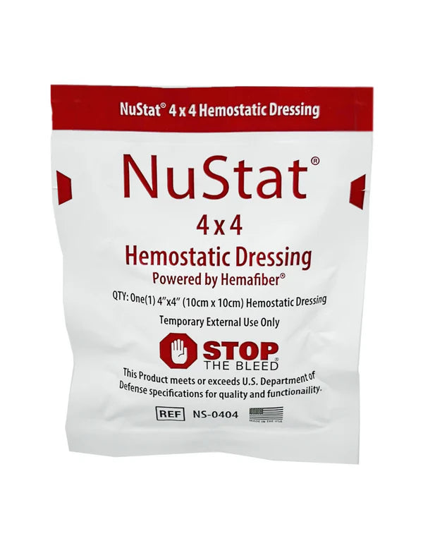 The NuStat Hemostatic gauze pad is designed to promote rapid blood coagulation in the event of a traumatic wound involving an arterial bleed. The 4" x 4" Hemostatic pad's patented and natural formula, works independently of the body’s normal clotting mechanisms to clot blood even where normal clotting is slow or impaired. Applying the pad and applying pressure is a safe, easy and very effective solution to traumatic bleeding situations. Fast-Acting Solution to Control External Bleeding injuries. Clots the blood fast with Hemafiber technology in the pad. No coatings that can be washed away or left behind. Blend of cellulose and silica-based hemostatic fibers.