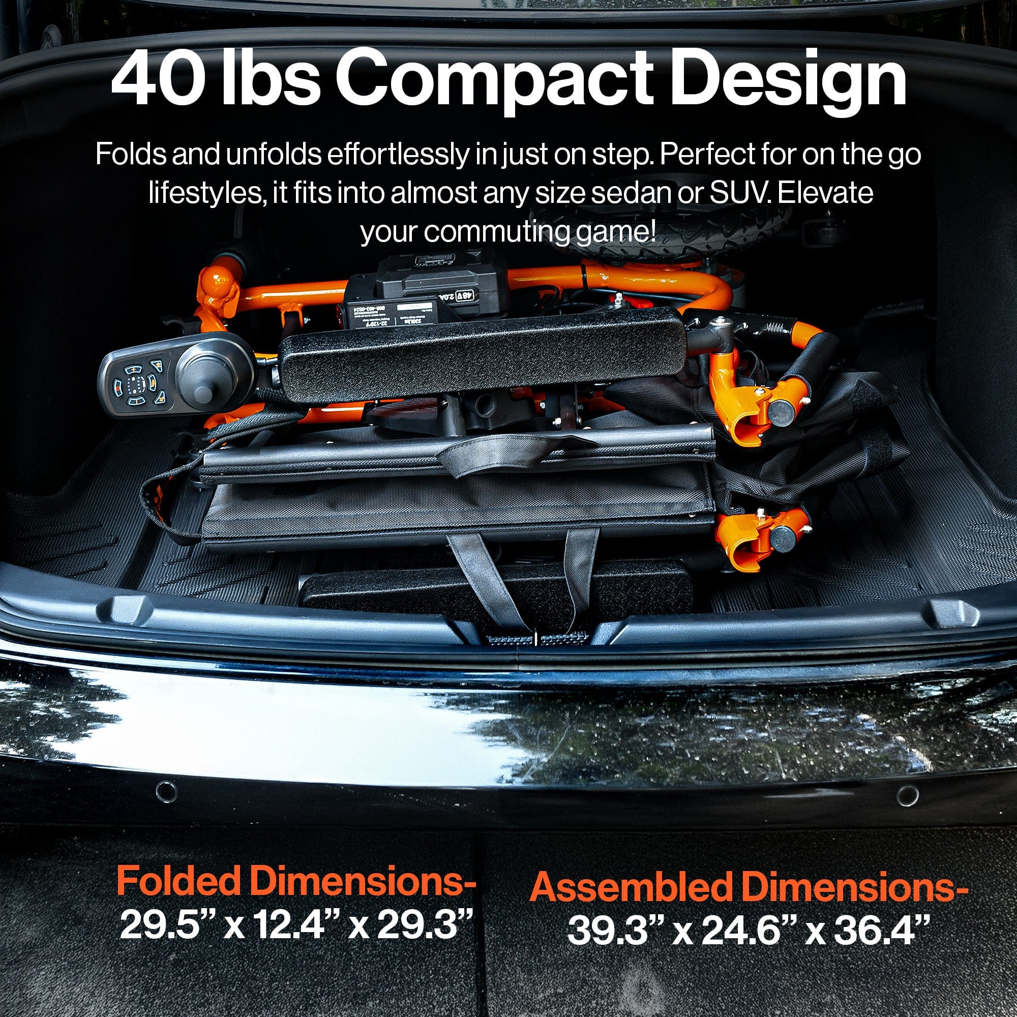 Explore the freedom of mobility with the SuperHandy Electric Wheelchair. Only weighing 42 pounds, this wheelchair is designed to support up to 300lbs comfortably with its 18.5-inch wide, high-density foam seat, this wheelchair combines comfort with durability. Its foldable, lightweight frame ensures easy transport and storage, perfect for the traveler. Dual 250W motors provide a top speed of 3.7MPH, while electromagnetic brakes offer safe stopping. Maneuver effortlessly with zero-turn capability and a 360° joystick, gliding over various terrains with stable, smooth-riding tires. Empower your independence with every journey. Wheelie bars are included to keep the user from tipping over. | Key Feature 1 value: 300Lbs | Key Feature Title: Max Rider Weight | Key Feature 2 value: Up to 4 Miles | Key Feature 2 Title: Per Battery | Key Feature 3 Value: 3.7MPH | Key Feature 3 Title: Top Speed | dimensions: Assembled: 39.3" x 24.6" x 36.4" - Folded: 29.5" x 12.4" x 29.3" (L x W x H Inches) | color finish: Orange | wheel size: 12" Rear 7" Front | motor: Dual 250W Electric Motors | operation type: Rider-Operated | battery type: 48V Li-Ion | brand model compatibility: SuperHandy - GUO050 & GUT138 | frame material: Aluminum | handle material: Rubber | tire tread type: All-Terrain | weight limit: 300Lbs | tire type: Rear: Pneumatic, Front: Solid | product weight: 40 Lbs