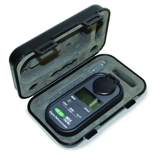 Each Digital Refractometer comes with a 1-year warranty and includes a hard shell case with protective lining, rubber grip & prism cover, disposable transfer pipette, AAA battery, and instruction manual.