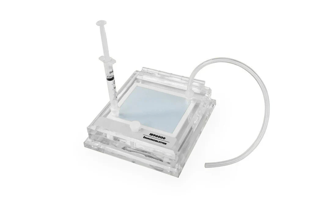The Immunoblotter is ideal for primary and secondary antibody staining of post-Western Blot transfer membranes. Designed to streamline the staining process, it allows for blocking, staining, and rinsing membranes without removing them from the chamber. This not only saves on buffers and costly antibodies but also eliminates the need for rocking platforms. The chamber measures 7.5cm long by 9cm wide and has a volume of less than 4ml, requiring only 3-4ml of antibody solution to cover the membrane completely. Constructed from durable cast acrylic, the Immunoblotter offers reliable performance and longevity. It features an easy-to-use design, allowing you to inject the antibody staining solution directly into the chamber using a luer-lock syringe or small pipette tip. A large syringe connects to the injection port, enabling efficient solution transfer through the exit tube into a waste beaker. The unit also comes with skid-proof rubber feet, a drain tube, and an operation manual. Simply clean with warm water and light detergent between uses. Physical Specifications: Unit dimensions: 5.0cm (H) x 14.0cm (W) x 15.2cm (L). Chamber dimensions: 9cm (W) x 7.5cm (L). Chamber volume: Less than 4ml. Weight: 2.5 lbs.