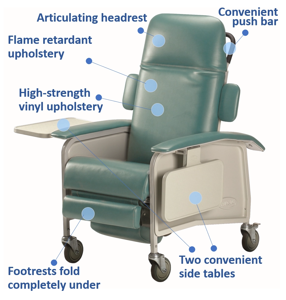Designed for prolonged seated comfort during medical procedures, the recliner includes two convenient side tables for prep materials, IV poles, monitors, or supplies, an articulating headrest for better patient visibility, fold-under footrests for easier standing, blow-molded removable side panels for fast cleaning, and flame-retardant, fluid-resistant upholstery (CA117 compliant) to meet strict healthcare hygiene and safety standards.