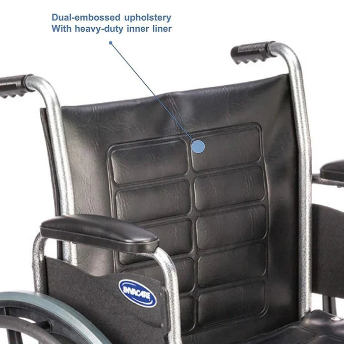 The Invacare Tracer IV Heavy-Duty Wheelchair (SKU: T422RDAP) is a robust, long-lasting manual wheelchair built specifically for heavier users and demanding environments. It features a spacious 22" W x 18" D seat frame, 350 lb weight capacity, reinforced heavy-duty carbon steel construction with gusseted sides, caster journals, and dual cross-braces, fixed-height padded conventional desk-length arms for comfort and easy transfers, dual-axle positions for seat-to-floor height adjustment (Adult 19.5" or Hemi 17.5"), 8" composite front casters, 24" urethane corded rear tires for a smooth ride, heavy-duty inner liners to prevent upholstery stretching, and an attractive silver vein finish.
