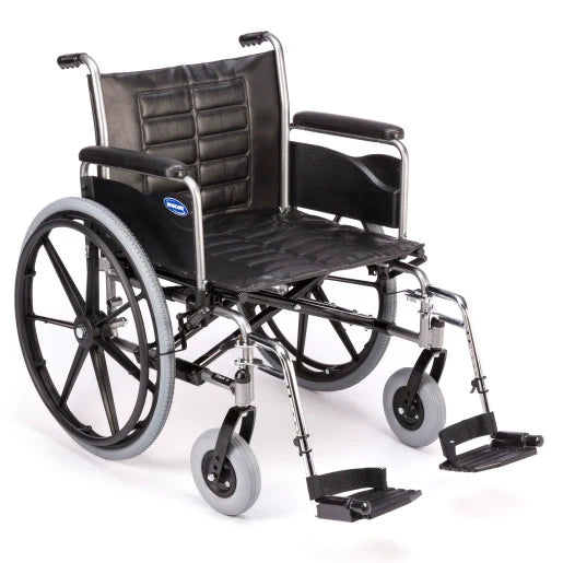 Invacare Tracer IV Heavy-Duty Wheelchair (SKU: T422RFAP) is a robust, long-lasting manual wheelchair engineered for heavier users and demanding daily use in home care, rehabilitation, long-term care facilities and community environments. It features a spacious 22" W x 18" D seat frame, 350 lb weight capacity, reinforced heavy-duty carbon steel construction with gusseted sides, caster journals and dual cross-braces, fixed-height padded conventional full-length arms for comfort and easy transfers, dual-axle positions for seat-to-floor height adjustment (Adult 19.5" or Hemi 17.5"), 8" composite front casters, 24" urethane corded rear tires for a smooth ride, heavy-duty inner liners to prevent upholstery stretching, and an attractive silver vein finish.