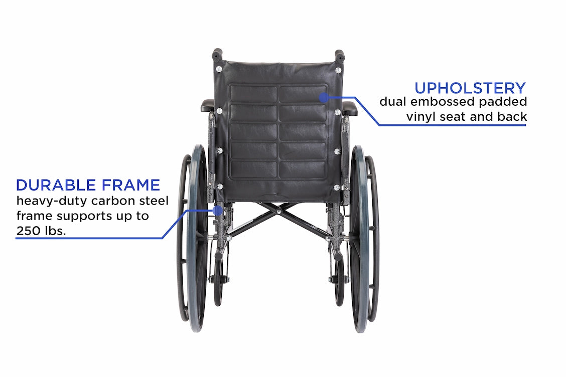 - Dual-axle system – tool-free adjustment between Adult (19.5") and Hemi (17.5") seat-to-floor heights for foot propulsion, self-transfer, or caregiver needs