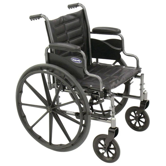 The Invacare Tracer EX2 Wheelchair (SKU: TREX20RFP) is a reliable, durable, and cost-effective manual wheelchair that combines features from the popular 9000 series with enhanced value and low-maintenance design. It features a comfortable 20" W x 16" D seat frame, 250 lb weight capacity, low-maintenance carbon steel frame, removable fixed-height full-length padded arms for easy side transfers and user comfort, dual-axle positions for seat-to-floor height adjustment (Adult 19.5" or Hemi 17.5"), 8" composite front casters, 24" urethane corded rear tires for a smooth ride, heavy-duty inner liners to keep upholstery taut, and an attractive silver vein finish.