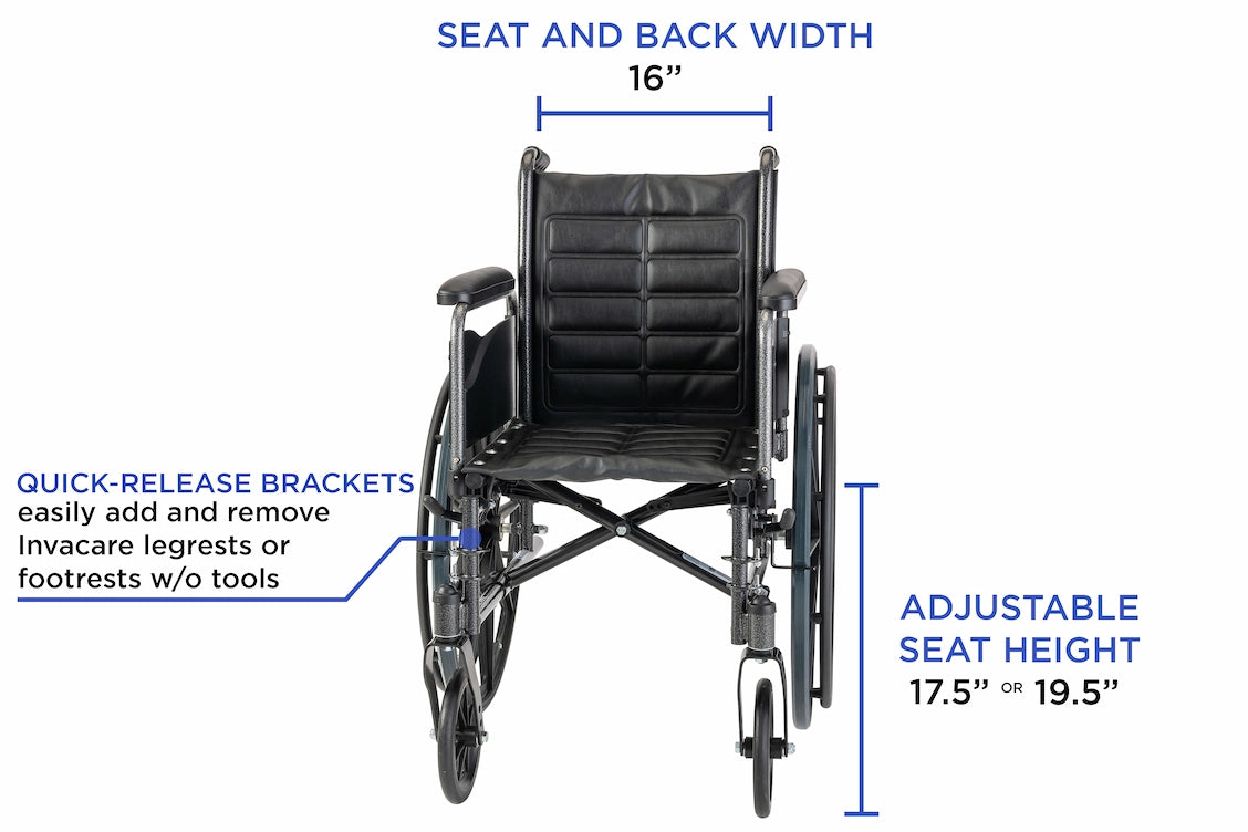 - Dual-axle system – tool-free adjustment between Adult (19.5") and Hemi (17.5") seat-to-floor heights for foot propulsion, self-transfer, or caregiver needs