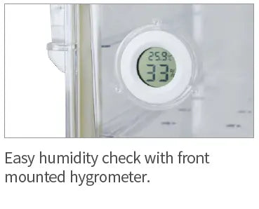 - Very convenient as equipped with a hygrometer to check the internal humidity from the front. (Reference type)