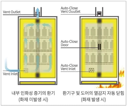 When the temperature reaches 50°C, the door automatically closes. When the ambient temperature reaches 70±10°C, the exhaust holes and ventilation openings are automatically closed, totally blocking the flow of heat from the outside in the event of fire -