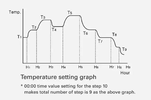 - 10 step programmable temperature, humidity, and illumination profiles and repeatable steps of up to 999 cycles.
