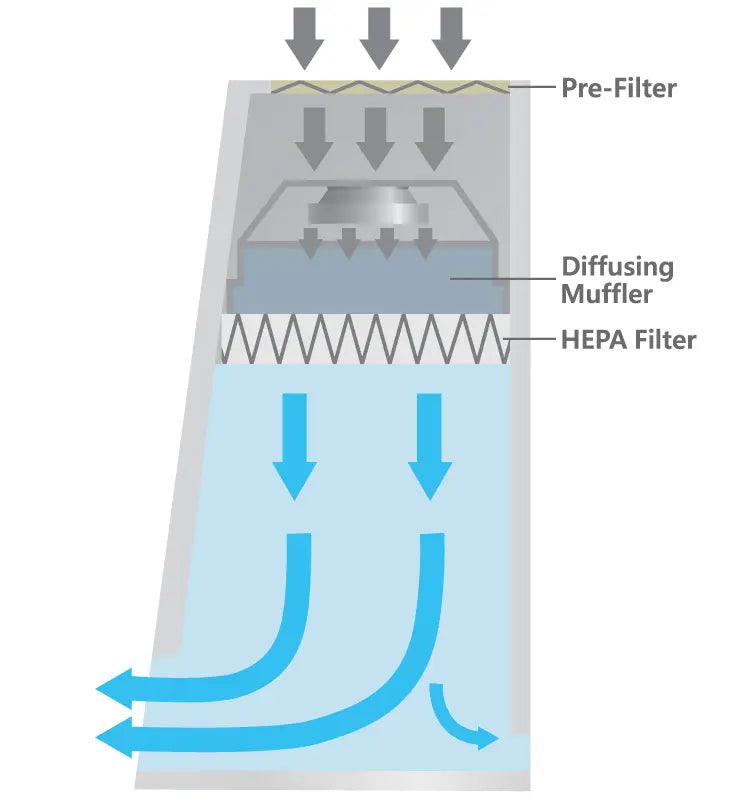 - 0.3 μm and larger particulates are removed with 99.99% efficiency, leak-tight HEPA filter which satisfying class 10.
