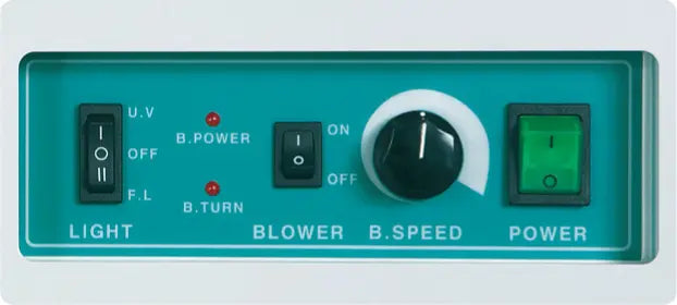 - Lighting mode selection by 3-position toggle switch (UV / off / fluorescent) preventing harmful UV exposure.