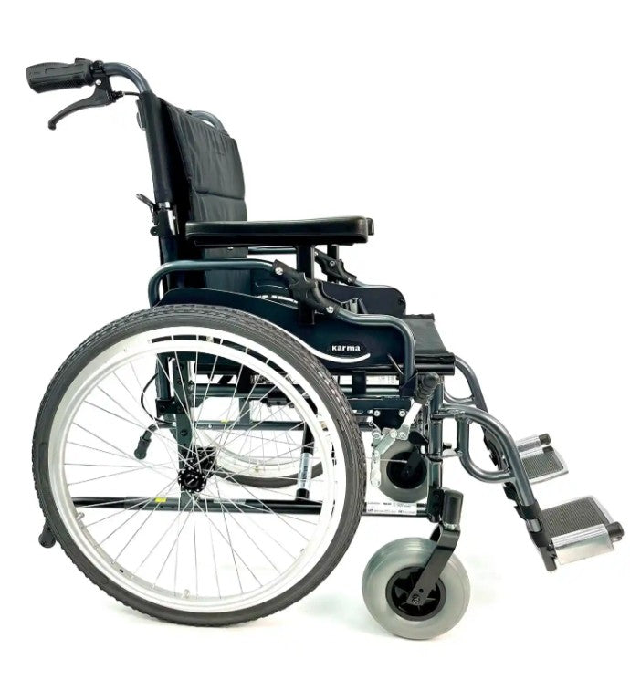 This heavy duty wonder from Karman is composed of high-quality, high-strength features flip-back armrests, quick relese axles, and is extremely lightweight. The chair comes standard with padded height-adjustable flip-back armrests with side panels and provides the user with the option of choosing either swing away or elevating leg rests. The durable construction is complimented by a high-grade flame-retardant, breathable nylon upholstery and for the user's safety, adjustable toggle wheels locks, seat belt, anti-tippers and adjustable-length anti-slip footplates.