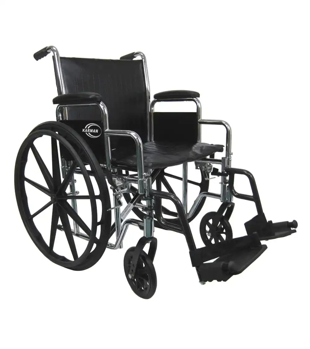 The Karman KN-92XW-APT series is a standard steel industrial strength bariatric wheelchair designed for heavy-duty use with detachable armrests for easy transfers. Featuring removable footrests and adjustable seat height for customized fit, it's ideal for users needing robust support and stability. The chrome frame offers a sleek, corrosion-resistant finish, while the lightweight construction (under 41-53 lbs) ensures maneuverability. Perfect for indoor/outdoor use with a focus on durability and comfort.