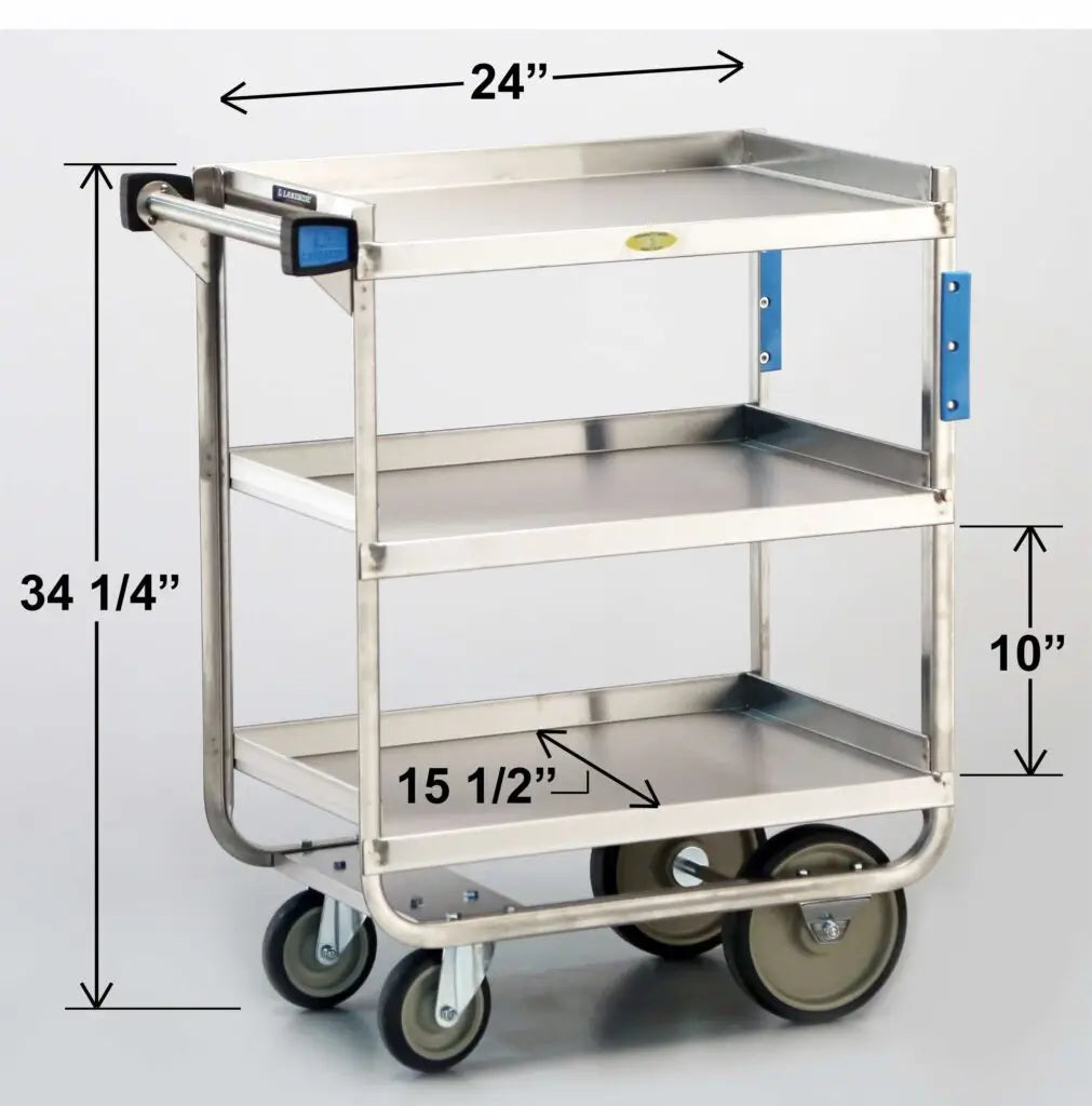 Utility Carts by Lakeside Manufacturing are ideal for hauling and restocking medical supplies, surgical equipment set-up, heavy-duty transport and storage. The Lakeside 711 Stainless Steel Utility Cart with (3) shelves measuring 15-1/2" x 24" has a 700-Lb. weight capacity.