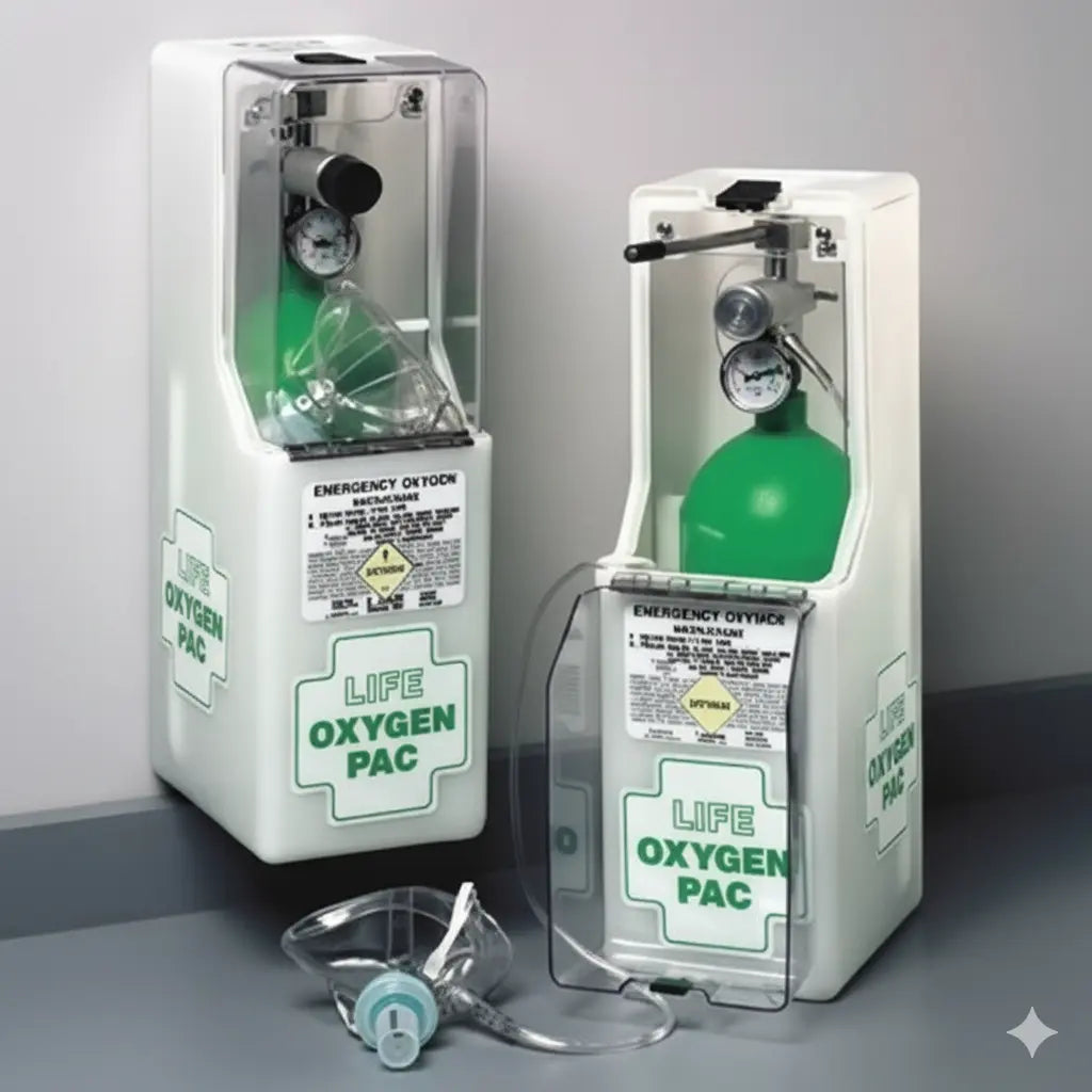 (1) Oxygen tank, 6 & 12 LPM. Simple On/Off Control Lever. 90-minute oxygen supply (at 6 LPM). Refillable by any compressed gas distributor. The Life Oxygen Pac provides supplemental oxygen as an inhalator for breathing victims and a CPR resuscitator adjunct for a non-breathing victim. Features a Life Mask for "mouth to mask" resuscitation with one-way valve. Portable or wall-mountable. Our oxygen tank supply's 90 minutes of oxygen for breathing or non-breathing victims. Simple On/Off Control Lever, 90-minute oxygen supply (at 6 LPM), refillable by any compressed gas distributor. The Life Oxygen Pac provides supplemental oxygen as an inhalator for breathing victims and a CPR resuscitator adjunct for a non-breathing victim.