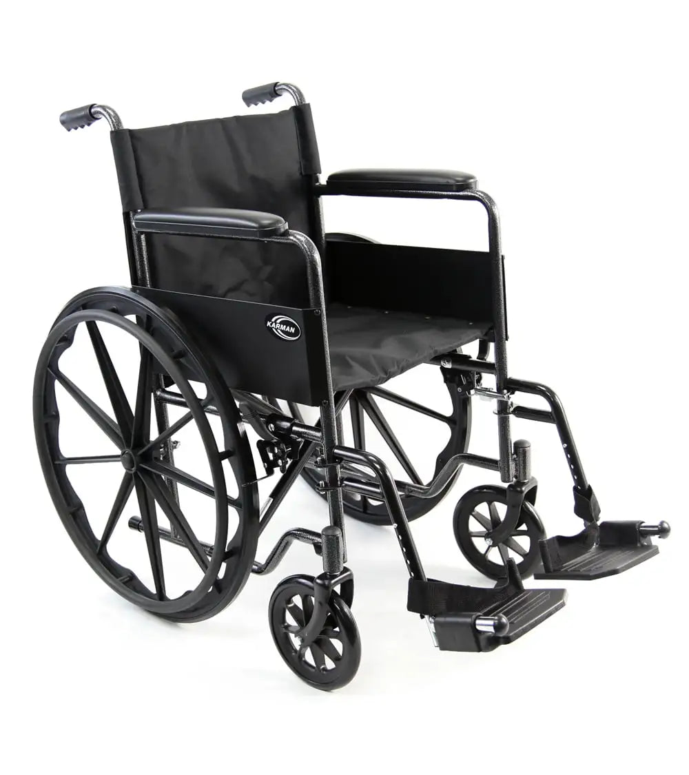 Karman LT-700/LT-800 Lightweight Steel Wheelchair with Fixed/Removable Arms, Adjustable Height and Swing/Elevating Footrest Options for Everyday Durability in Silver Vein