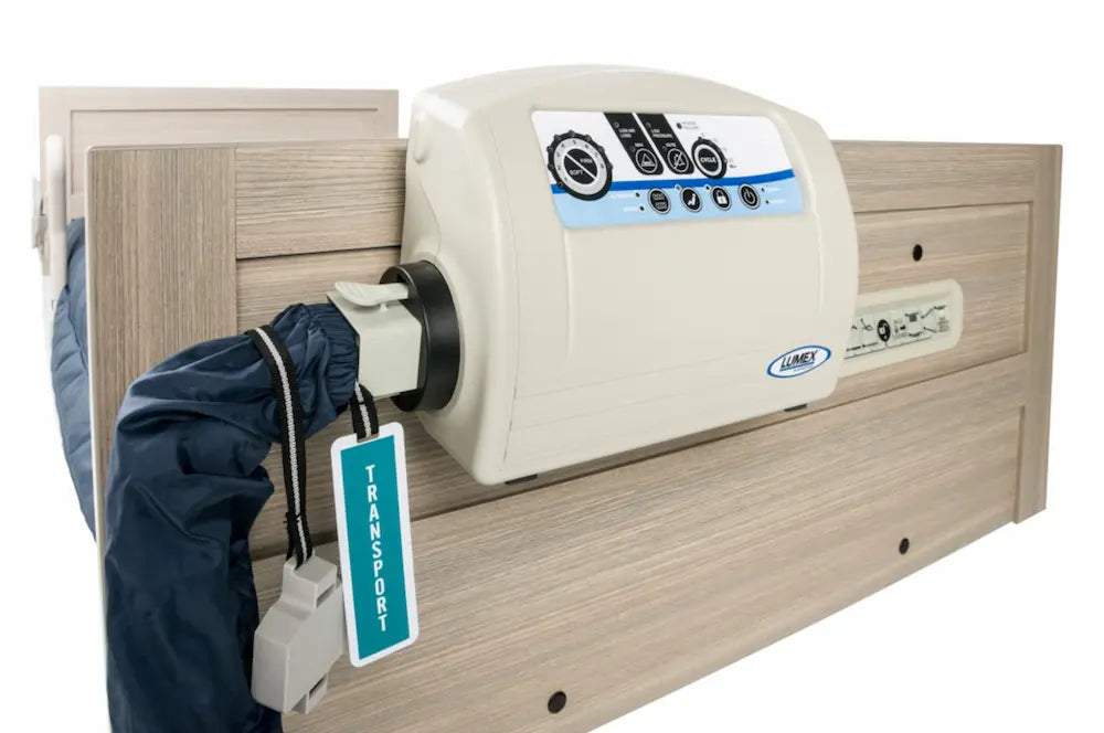 The Lumex Select LS400 is a high-performance alternating pressure/low air loss mattress replacement system engineered for advanced pressure ulcer prevention and treatment in higher-risk patients. The cell-on-cell technology ensures bottom cells remain inflated during power failure, providing uninterrupted low-pressure support and patient safety. The 2:1 alternation cycle (adjustable 5, 10, 15, or 20 minutes) inflates/deflates half the cells at a time, maintaining constant body support for effective pressure relief. An 8-level comfort adjustment plus Auto Firm mode allows precise customization, while the Fowler feature increases airflow to prevent bottoming out when the head section is elevated. Low-pressure audio alarm with 20-minute mute/reset enhances monitoring, and quick-release CPR valve enables rapid deflation in emergencies. The fully zippered quilted cover is breathable, fluid-resistant, and easy to clean. Ideal for hospitals, nursing homes, long-term care, and home health requiring robust pressure redistribution.