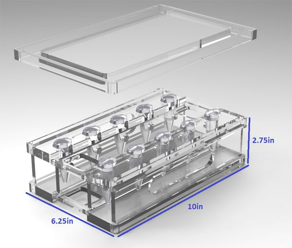 Magnetic bead separation racks. Features removable Magnetic "cartridge" and lid. Ideal for low or high volume elution scenarios. Remove cartridge, load tubes, with lid in place mix tubes. Then, insert cartridge to apply Magnetic field. Durable and cleanable PETG construction with powerful neodymium Magnets. Handle cut-Withouts on side for secure grip during flip. Choose from 1.5ml microcentrifuge tube or 5ml microcentrifuge tube version. And, choose from 10 or 20 tube capacity. See images for dimensions. CONSUMABLES NOT INCLUDED. Made in the USA.