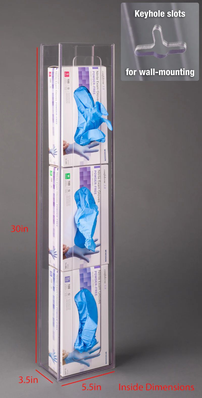 Store glove boxes in a narrow configuration: either vertically or horizontally. Choose from: Wall Mount (screws and anchors included),Magnet Mount (powerful Magnets included). Comes in two or three box capacity. Made from super durable PETG.