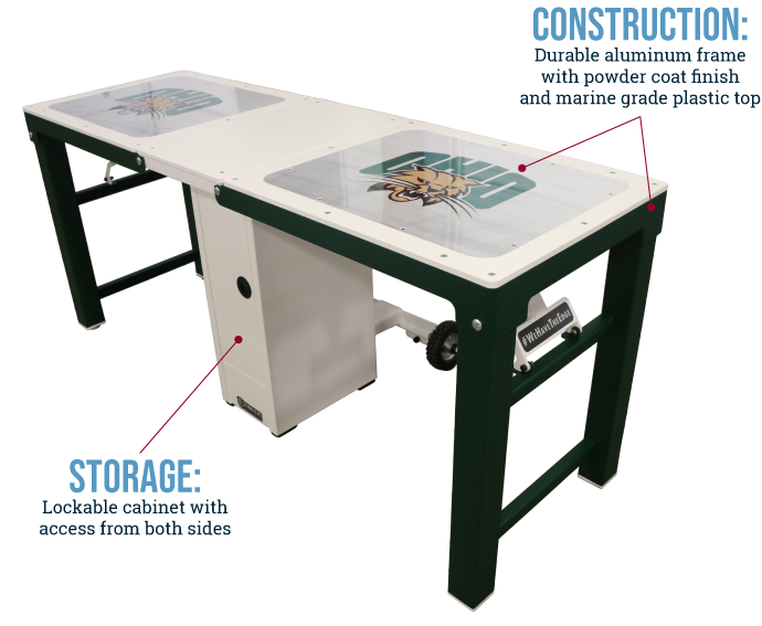 The Aluma Elite Portable Workstation, with industry leading mobility features, is Athletic Edge’s latest solution for sideline treatment and care. Made from aluminum, and complimented with a rugged, textured powder coat finish, this workstation offers an affordable and convenient solution for treating your athletes. The Aluma Elite Portable Workstation also features a stow-away handle, lockable storage cabinet that is accessible from both sides, marine grade plastic top and graphics package including two logo panels on top.
