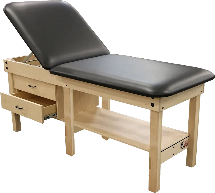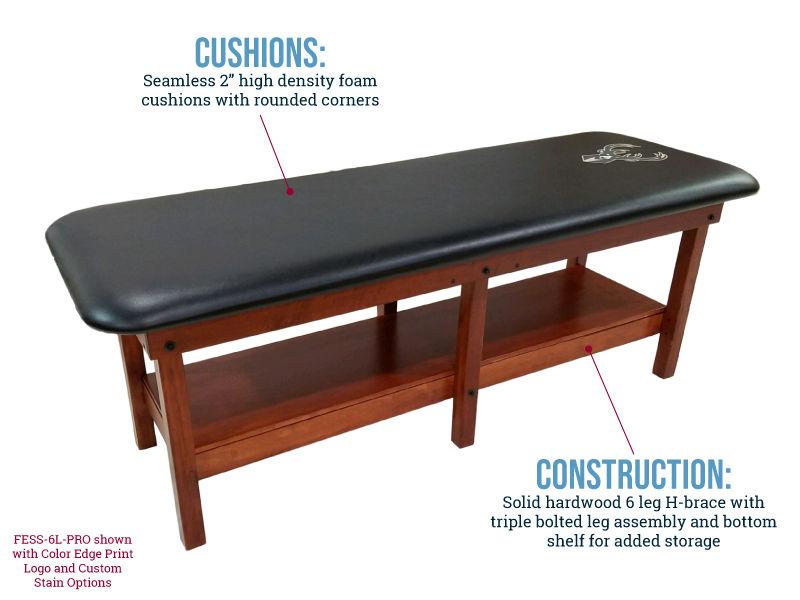 Designed for greater stability with added length, our PRO 6 Leg Edge Sport Wood Treatment Table offers a rich variety of standard options as well as customizations to meet the specific needs of your athletic training room. Each table carries up to 800 lbs. and comes standard with solid hardwood legs and base, H-brace construction with shelf, a thick 3/4” plywood top, comfortable 2” high density foam cushion, softly rounded corners and triple-bolted leg assembly. Make it your own with an additional cabinet that can be mounted on either end. Patient-friendly customizations include a nose hole, 70° manual lift back with 6 position elevation and 45˚ split leg elevation.