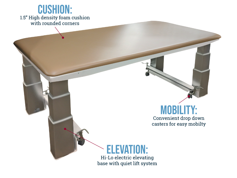 The table features 18-33” height range, single foot control, 1.5” high density foam flat, seamless cushion and convenient drop down casters.