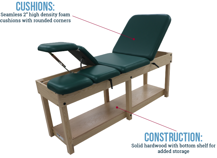 The flexible split leg design of this solid hardwood treatment table makes it extremely functional for multiple treatment positions. Each padded leg cushion can be manually adjusted to the desired hip and knee flexion positions making treatments easier and more comfortable for the athlete and athletic trainer.
