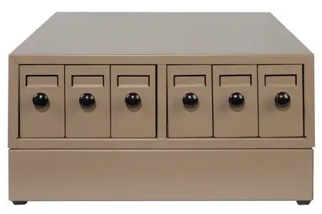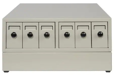 Each cabinet has six individual drawers and holds up to 5,000 standard 3" x 1" glass slides. A base unit, sold separately, provides solid support for the cabinet and rests on scratch-proof rubber feet. Cabinet and base are available in standard beige or ivory.
