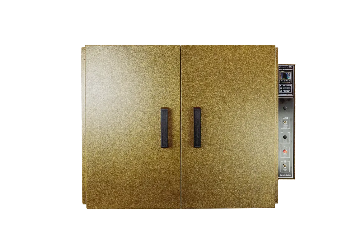 - All bench ovens have aluminized interiors. High impact thermoplastic cool handles are used