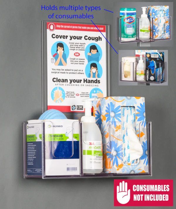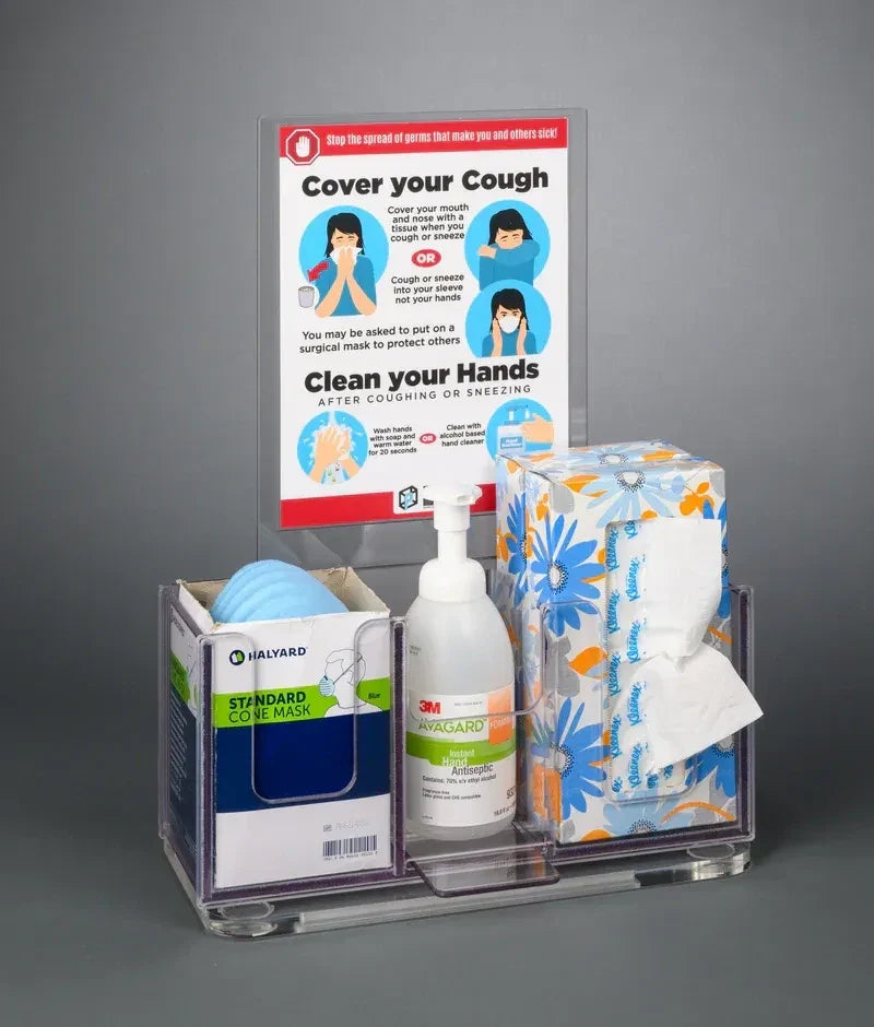 Poltex’s RESPQ Respiratory Hygiene Station Q (also known as cough station, flu station, sanitizing station, or infection prevention station) is a versatile, hygienic organizer designed to display and dispense consumables that help prevent the spread of infection in hospitals, clinics, workplaces, offices, restaurants, or any public space. Constructed from durable 1/4" thick PETG with polished edges for a clean, professional look, this station securely holds masks, wipes, tissues, hand sanitizer, or other PPE essentials. Signs are removable if not needed, allowing customization or a clean appearance. Choose your mounting option and sign type for flexible placement and clear communication.