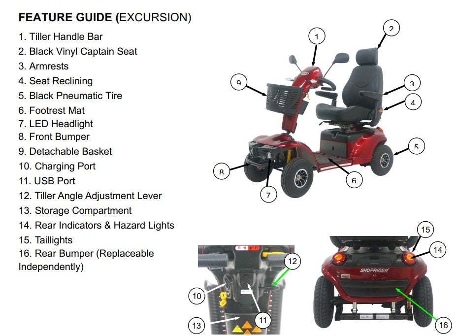 The Excursion is a heavy duty four-wheel scooter with a 500 lb. weight capacity. It has an advanced tiller which houses the controls for the lighting system, turn signals, wig wag and horn. It has a dual purpose wig wag which allows the user to push forward or pull back on the drive lever depending on dexterity for ease of driving. The unit comes standard with a 20in. seat that can accommodate most riders, and has swivel and recline features for added comfort and ease of use. It also features a full suspension to allow for smoother ride operation on most terrains.